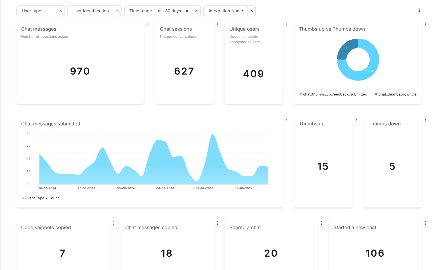 In the Analytics dashboard you can see key statistics about how users engage with your AI assistant.