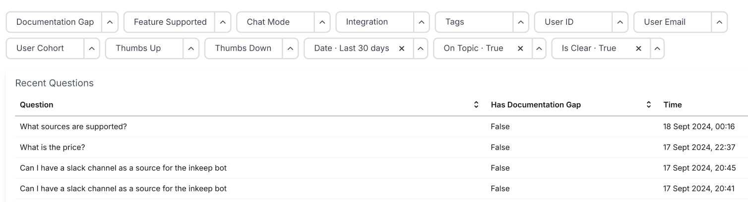 - Use AI filters - drill down on questions where there wasn't supporting content in your documentation.