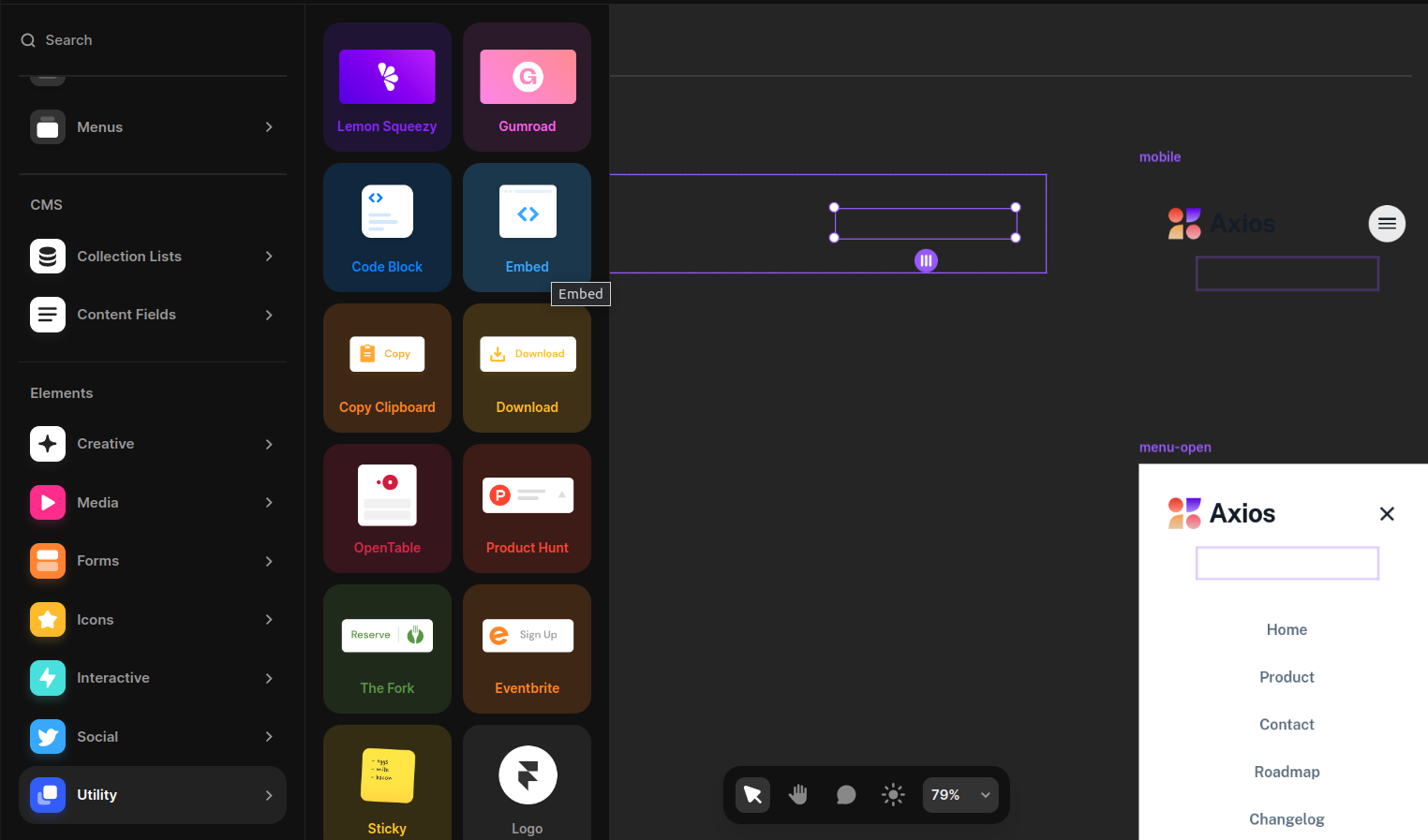 - Select the Embed item in the Utility section