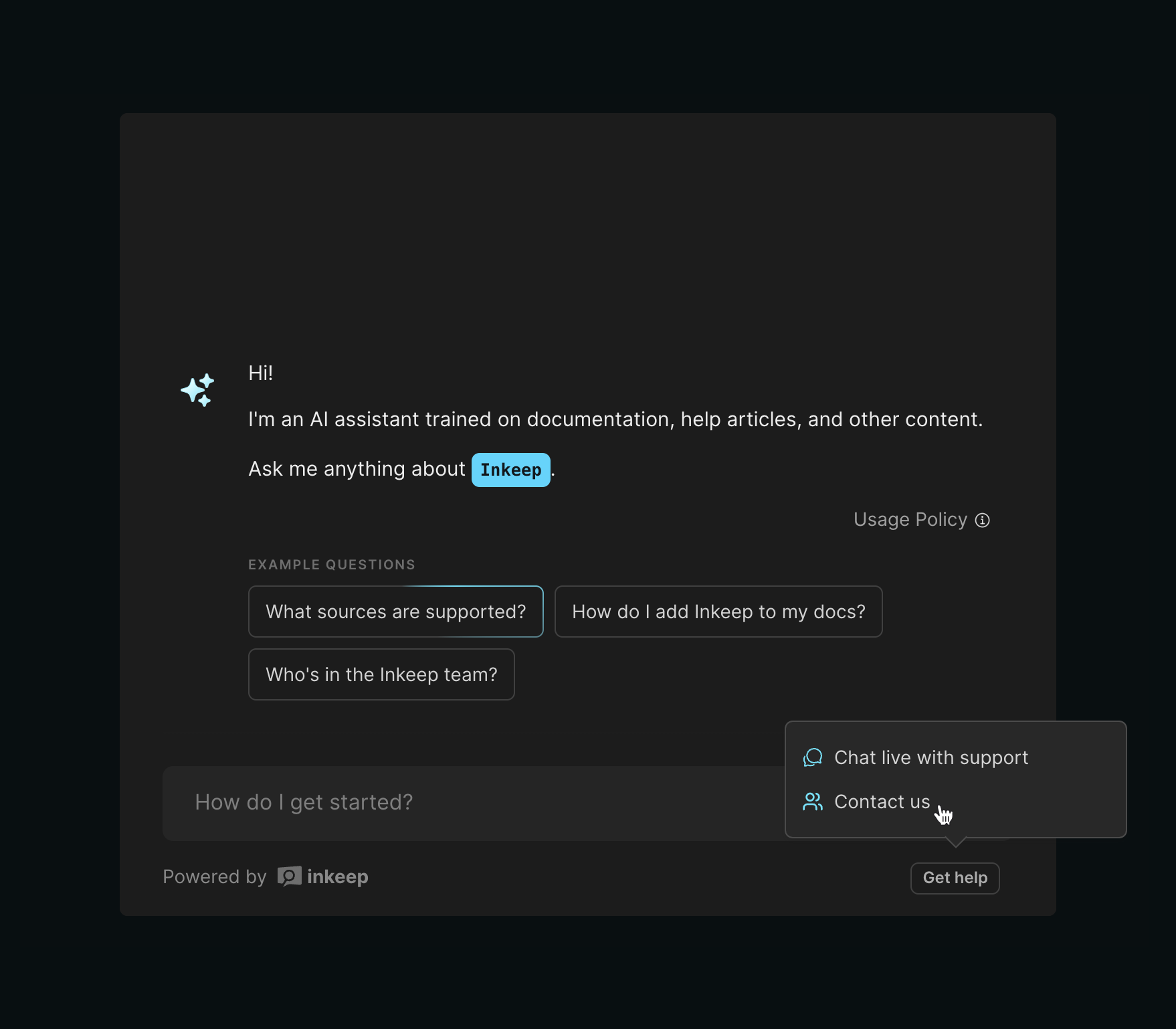 Settings for Inkeep's AI-powered chat features, including AI assistant's personality, workflows, tools, and UI customization.